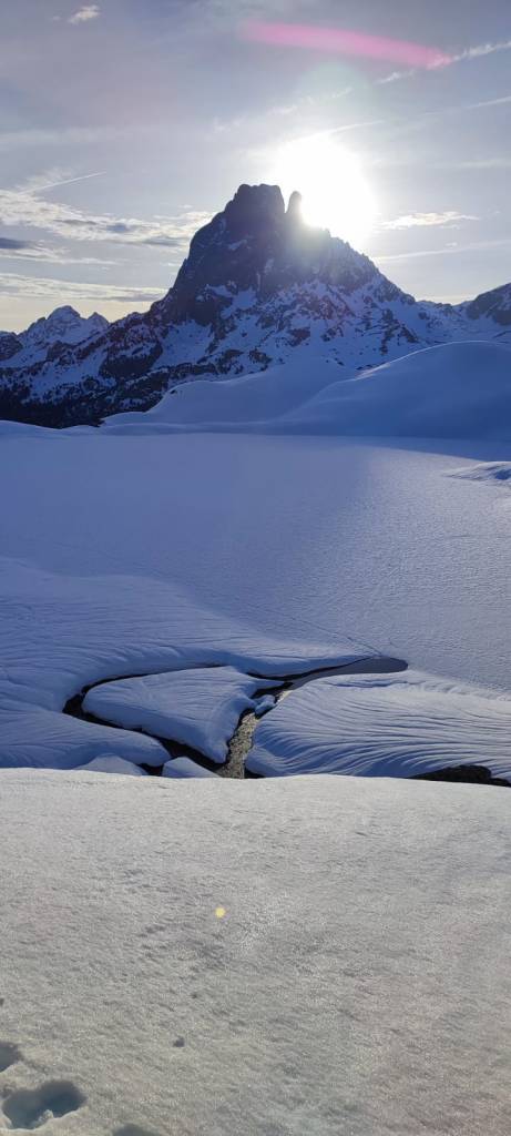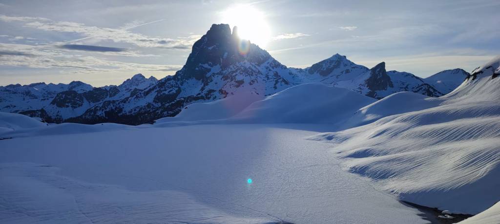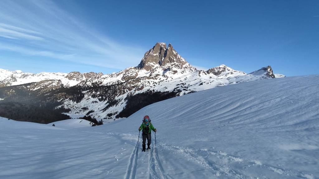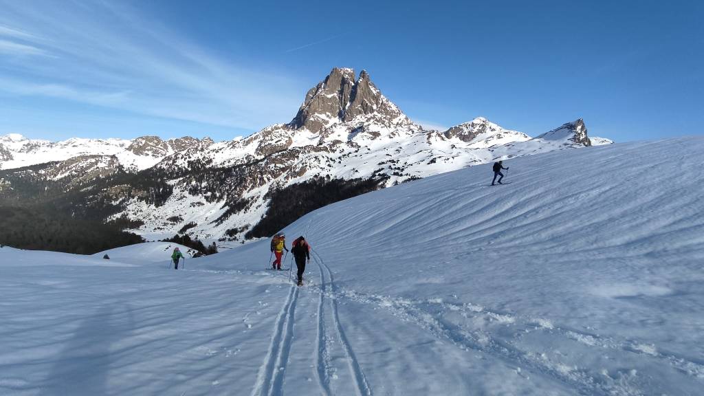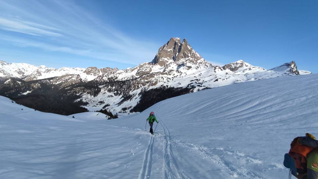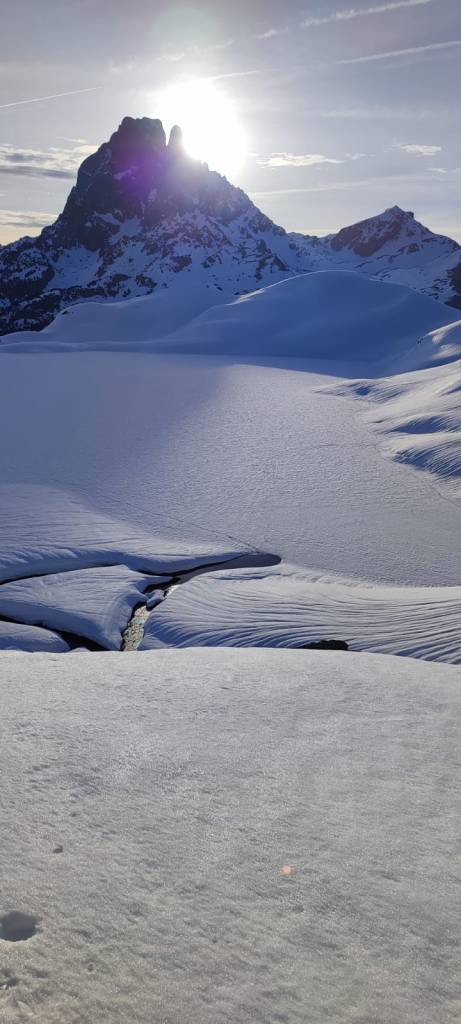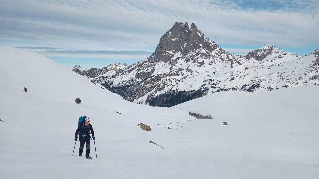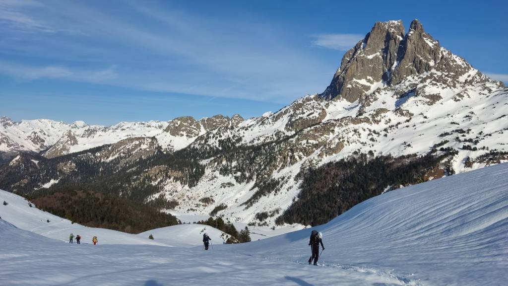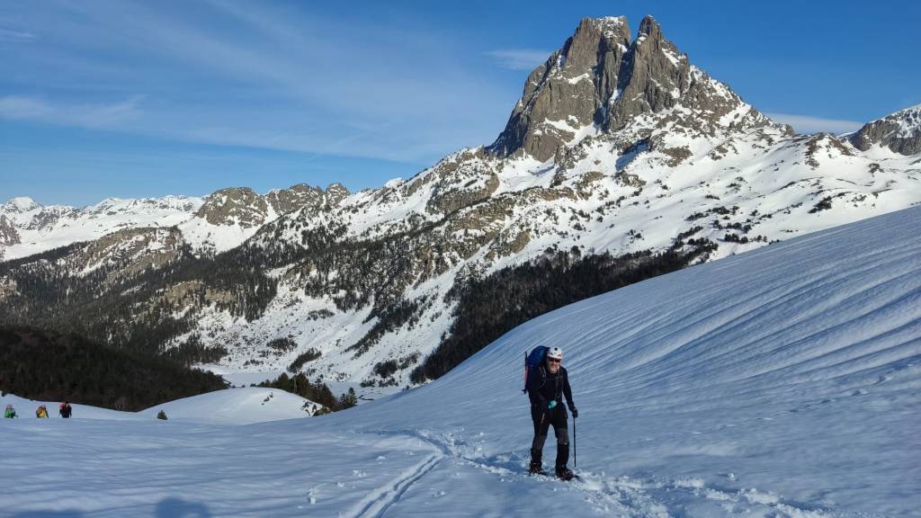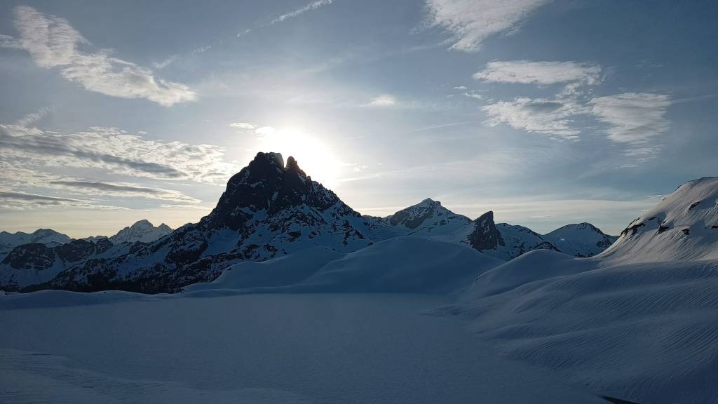 Después de varios retrasos por la sucesión de frentes coincidentes con los fines de semana, por fin se abrió la ventana de oportunidad para aventurarnos en el Tour al Midi D’Ossau en condiciones invernales. ¡Y qué condiciones! No nos quitamos las raquetas o los esquís de montaña en los dos días de ruta.