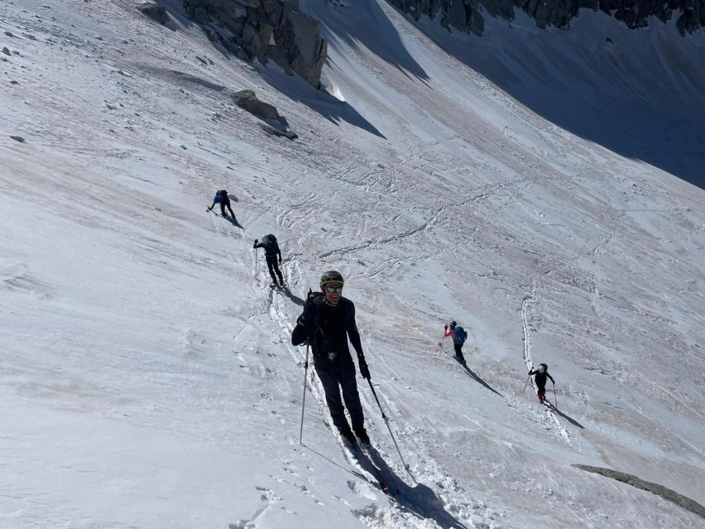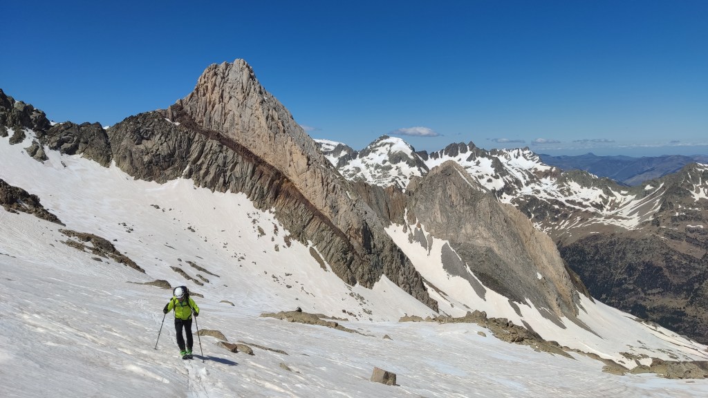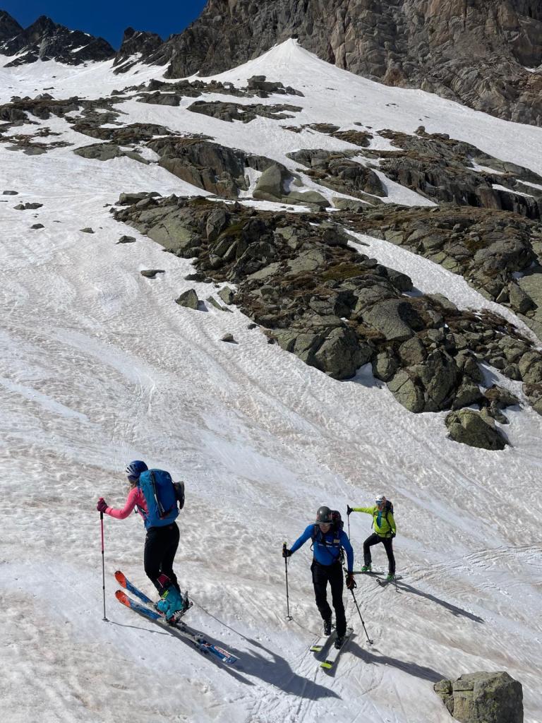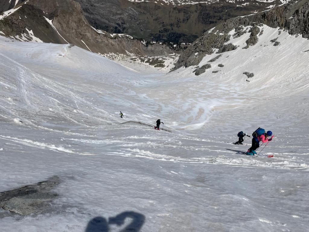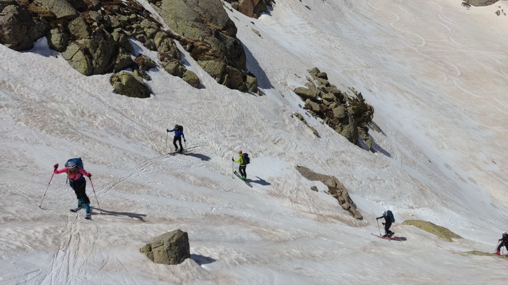 El descenso lo realizamos hacia el refugio de La Renclusa por unas grandes palas de nieve primavera (excepto en la parte alta), disfrutonas de esquíar.