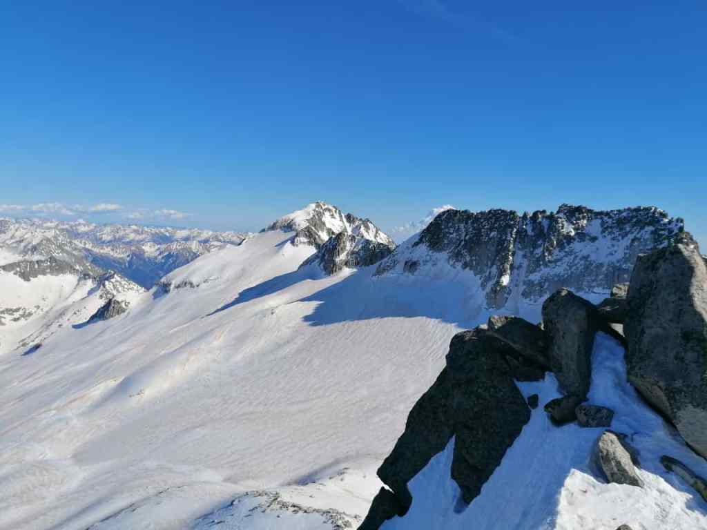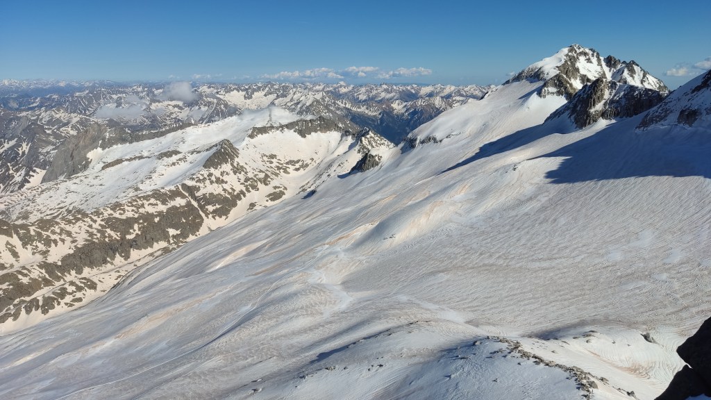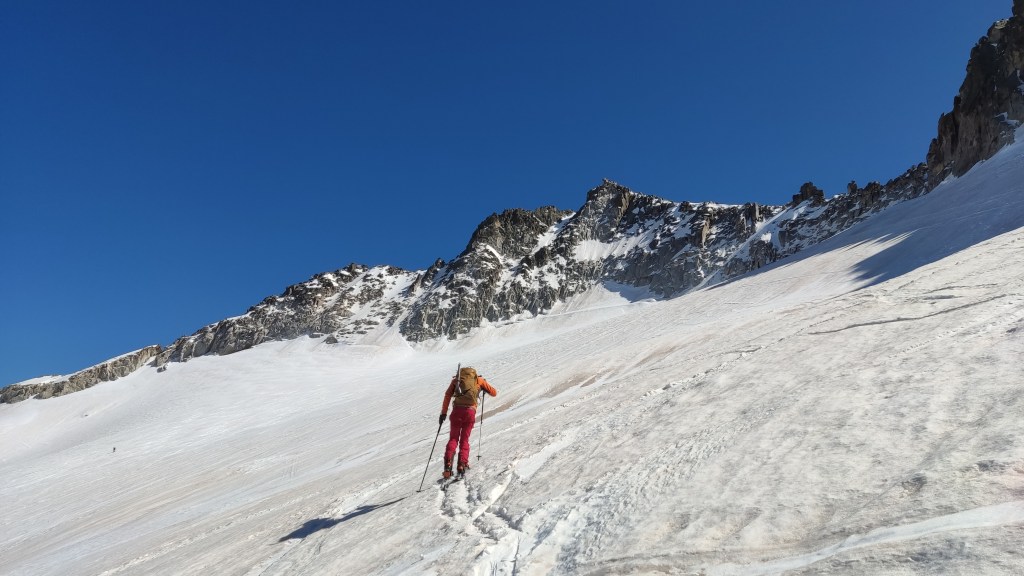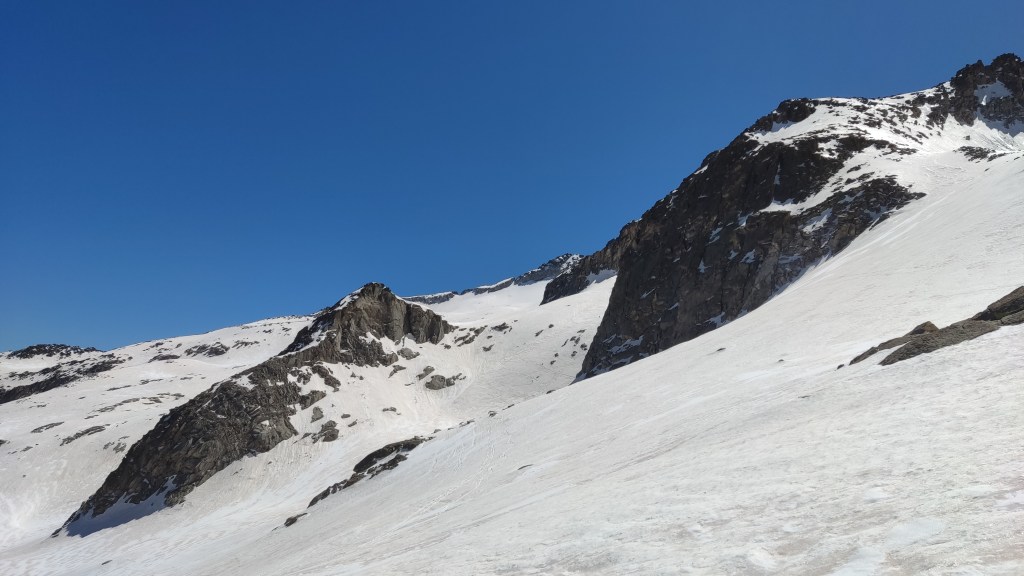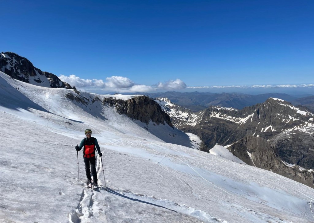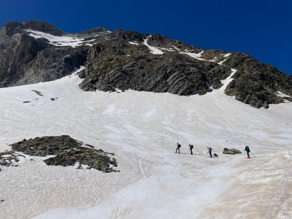 El descenso lo realizamos hacia el refugio de La Renclusa por unas grandes palas de nieve primavera (excepto en la parte alta), disfrutonas de esquíar.