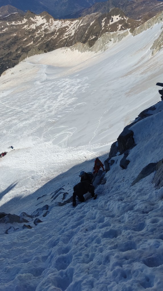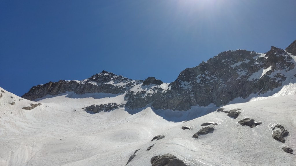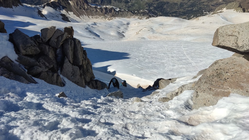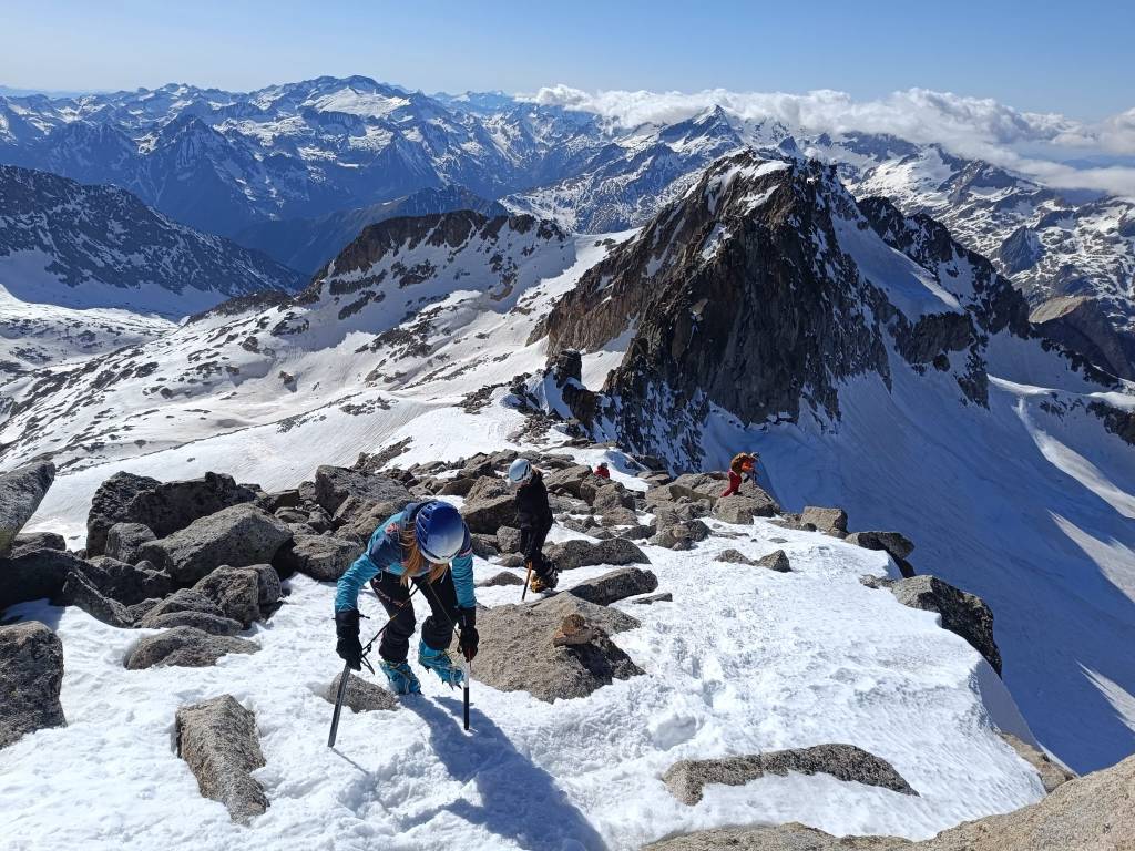 Comenzamos en los Llanos del hospital, subiendo por los tubos de Paderna para ir ganando altura hacia el Pico del Alba, Pico Mir, Cordier… hasta situarnos a los pies del corredor de la rimaya que da acceso a la cresta pirncipal de La Maladeta.
