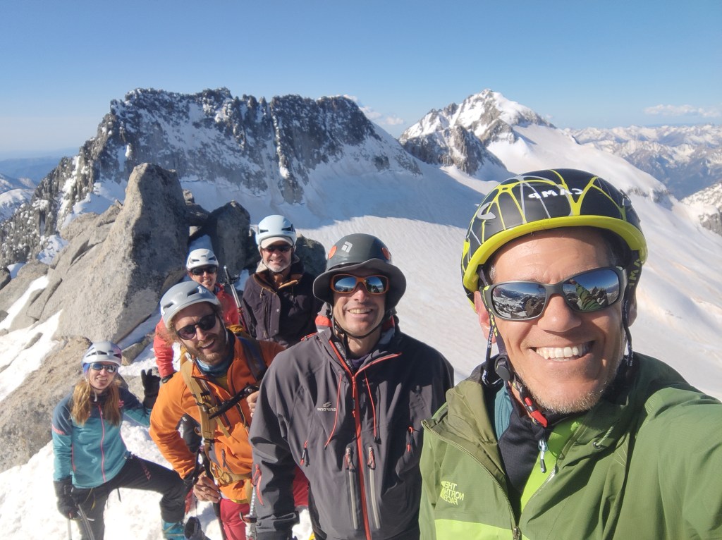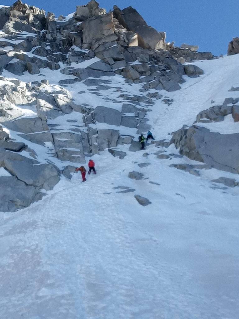 Ascendimos por el corredor donde nos encontramos una zona con de pendiente de unos 50º, las condiciones de la nieve eran buenas asi que con prudencia y concentración bastaba. La facil arista final nos dejó en la misma cima que pudimos disfrutar en solitario los 6 aristeros.