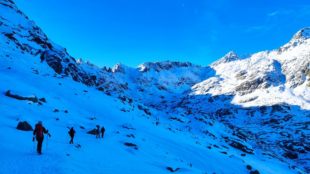 Una vez rebasada la laguna comenzamos a ascender por la canal de Las Hoyuelas. Al comienzo la pendiente era de unos 30º por una ancha canal, que poco a poco se iba estrechando y ganando inclinación hasta unos 40º/45º. La nieve no era mala, pero le faltaba algo de firmeza. Hacia el último tercio, debíamos abandonar la canal principal y encontrar un paso a través de unos muretes de roca que nos llevaría a unas campas de nieve a los pies de las Hoyuelas.