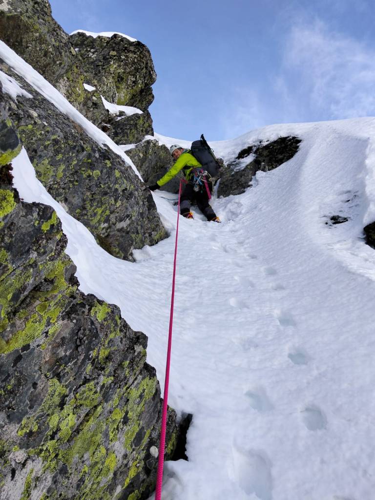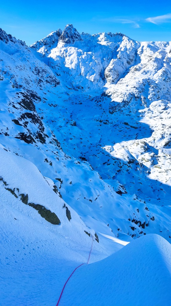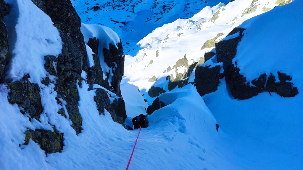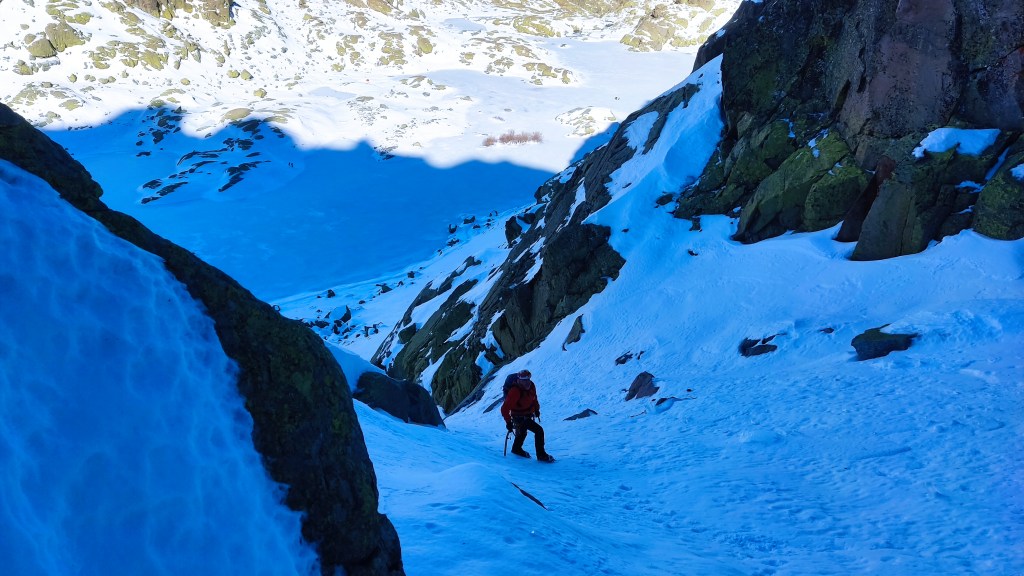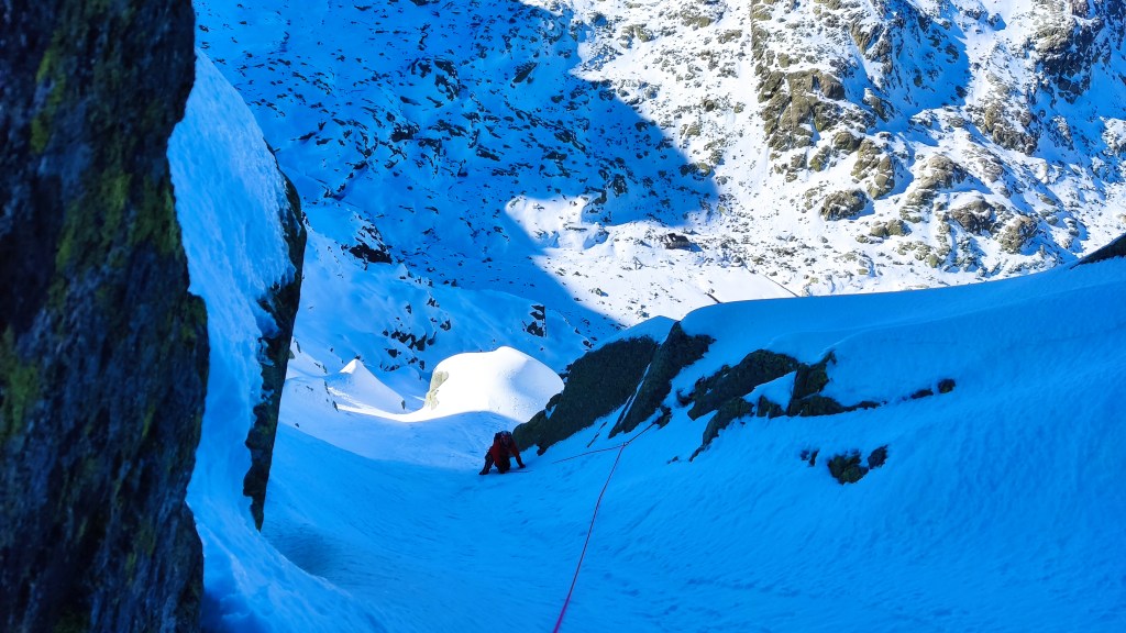Comencé el siguiente largo por el corredor, el cual, un poco más adelante quedaba dividido en dos gracias a un gran espolón rocoso. Yo elegí la opción de la derecha pues me pareció mas encajonada y vertical. Al girar a la derecha encontré un resalte al que le faltaba nieve y un estrechito corredor-goulotte, muy estetico que iba cogiendo inclinación hasta que en la parte final se ponia a unos 70º, opción que me sedujo por completo. La nieve por aquí era mala, inconsistente y costaba avanzar, pero a cambio iba encontrando sitios donde emplazar fisureros. Al salir del encajonamiento una pequeña rampa de nieve a uno 45º llevaba hasta un murete para montar reunión.